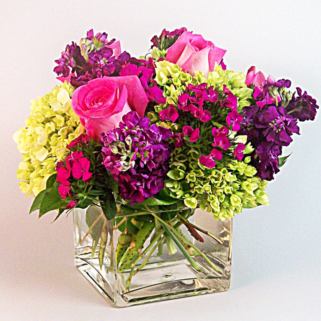 Classic- When we design purple stock, dianthus and pink roses with green hydrangea the result is a clear glass cube of simple pleasures. Flowers just have to say “HI” sometimes and this is the perfect arrangement to coat and sooth. Send this as a gift if you want to say hello or use this lovely piece on your table for that special occasion. Available in 3 sizes.