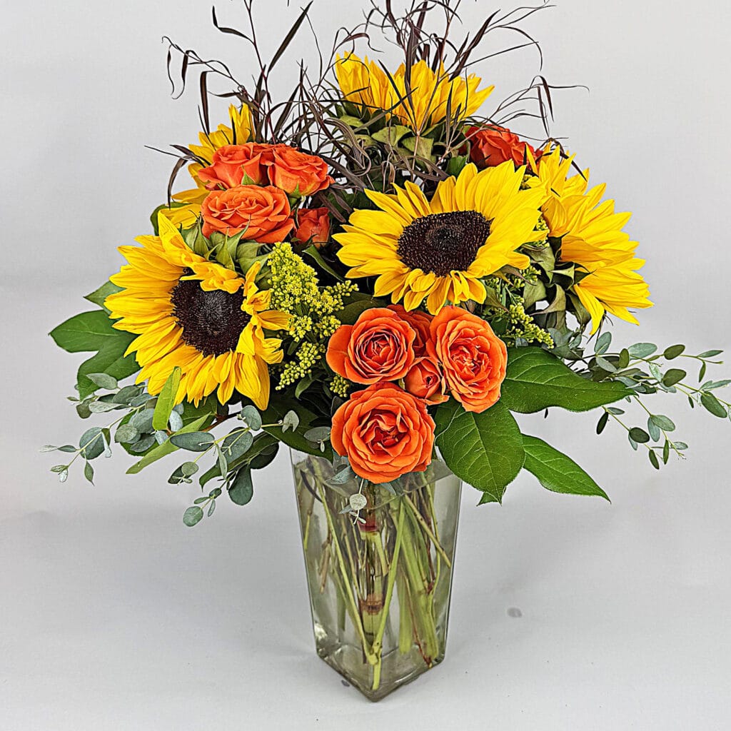 Well, it’s sunflower season and we don’t disappoint. A very simple combination of beautiful sunflowers and deep, rich orange spray roses. A little accent and texture to round things out and there you have it. Get em while you can. About 18″tall.