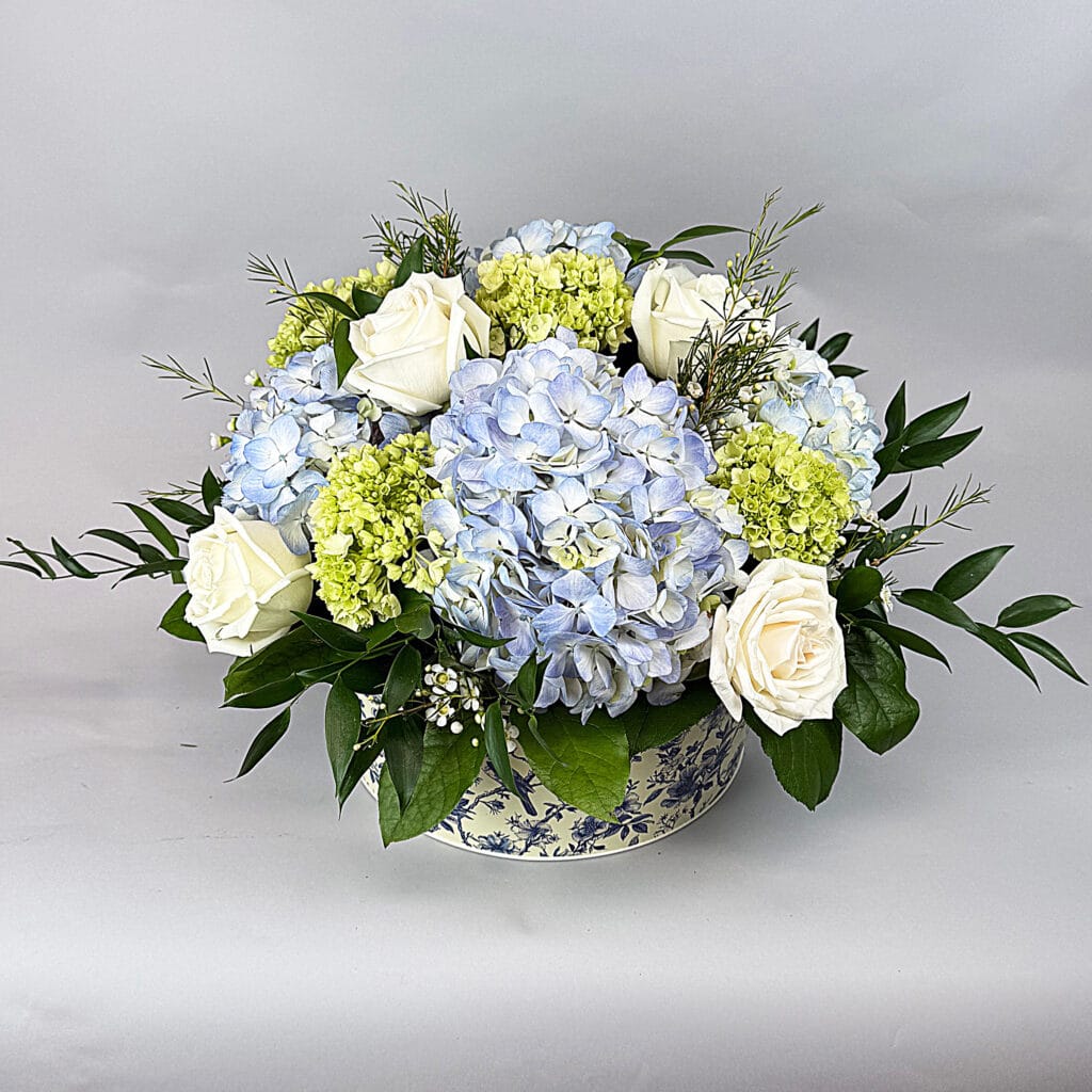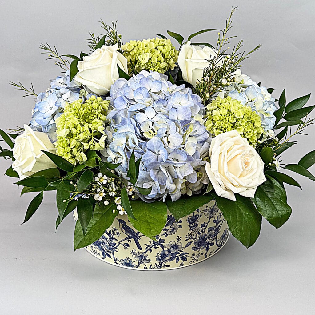 If you are having brunch with Mom, place this piece of warmth on the table. A low decorative tin bowl with warm blue hydrangea, not edible however, green hydrangea and white roses. Perfect for the kitchen or dining room table. This is a big piece, not for the faint of heart, but neither is a big brunch buffet. Mimosas sold separately.18″W x 12″T