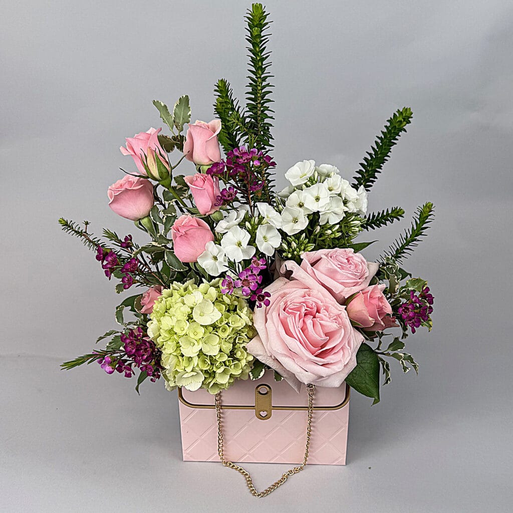 Everyone loves a good party, but when the party is in a purse, we are jumping to a new level. Bursting with pink spray roses and nice, big pink roses from Ecuador with white phlox which is such a delicate delight. Mimi Green hydrangea has it’s room in the purse as well. Enjoy the festivities.