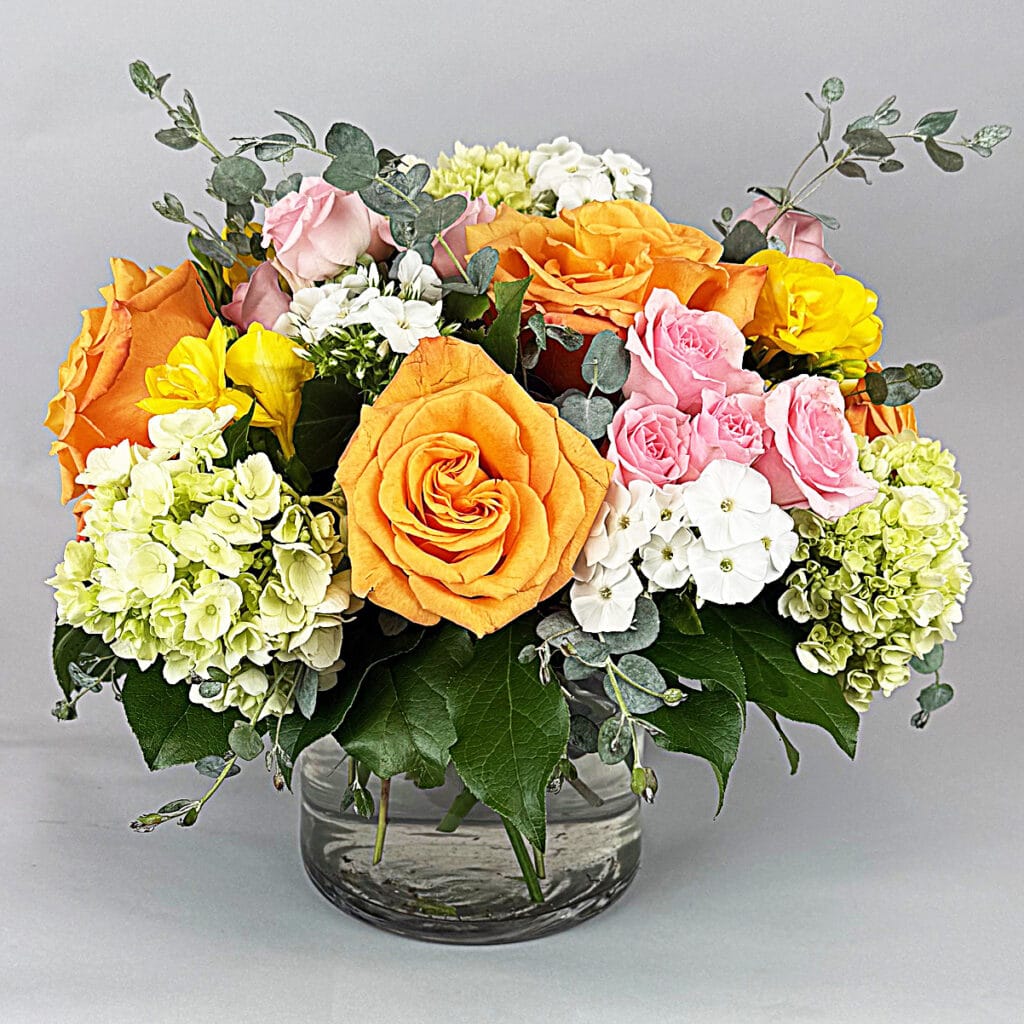 Do you feel the warmth radiating off of this glorious and colorful creation of fresh roses, hydrangea, and other garden favorites? Designed in a clear glass cylinder and is ready to be displayed on a kitchen table, coffee table or dinning table. 13″ tall and 13″ wide.