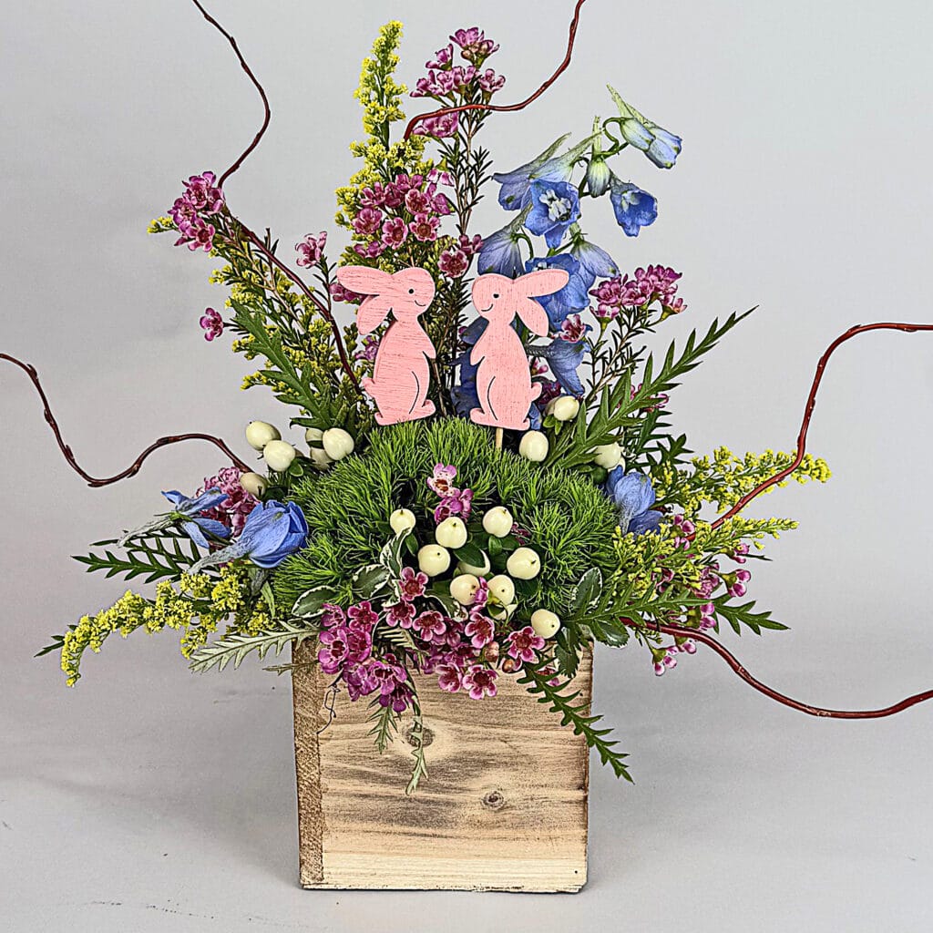 Spring is around the corner and love is in the air. Bunny love that is. Created in a woodland wood box and nestled in a bed of garden freshness, these bunnies are basking in their own glow. Perfect for a kitchen or coffee table.